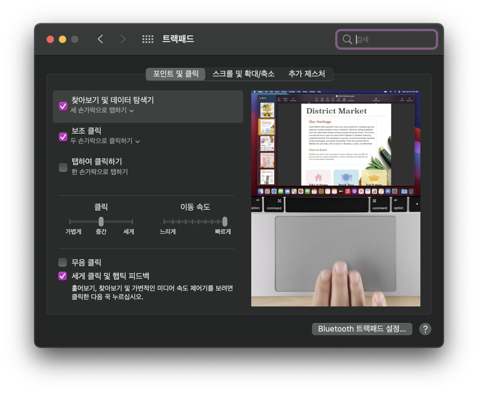 스크롤 방향, 스크롤 속도, 관성 사용 여부, 햅틱 반응 크기, 트랙패드 무음모드 등등 둘러보시면서 취향에 따라 필요에 따라 세팅하시면 됩니다.